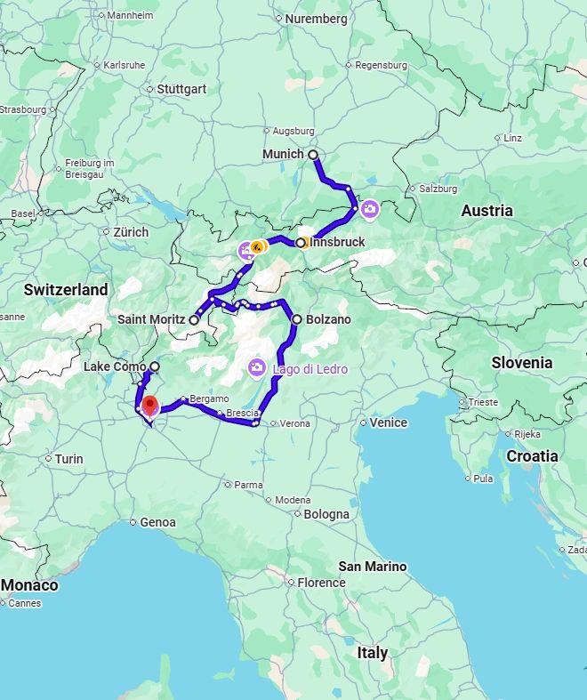 St. Moritz → Maloja Pass → Chiavenna → Bolzano: (Maloja Pass is spectacular—winding descent into Italy).